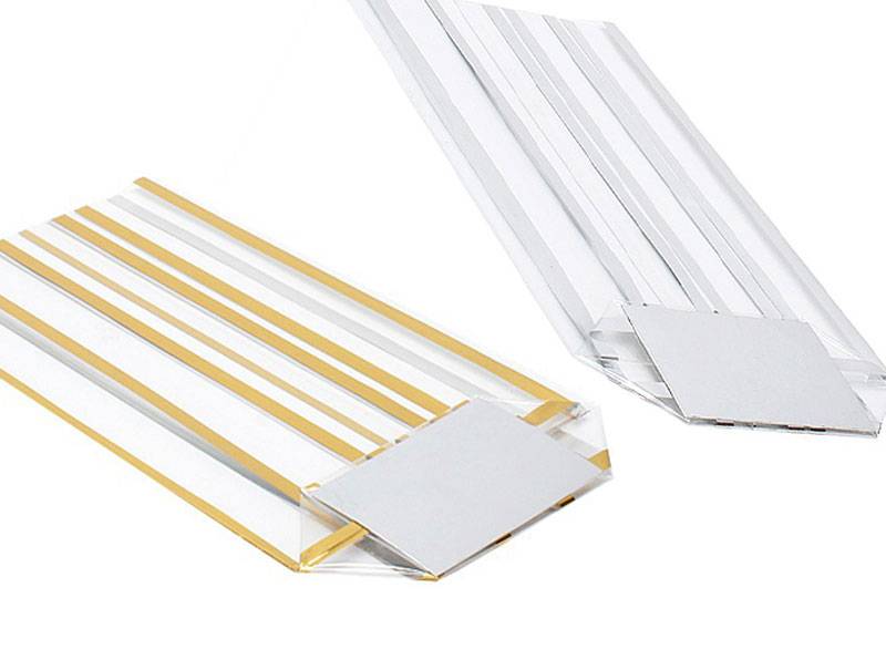 See here our handy and beautiful PP cross-bottom bag, 120x225mm, with a standard print. You have the choice of silver or gold stripes. These bags also have a handy bottom carton. Enjoy this "all in one" bag. The convenience and a beautiful appearance! Read more