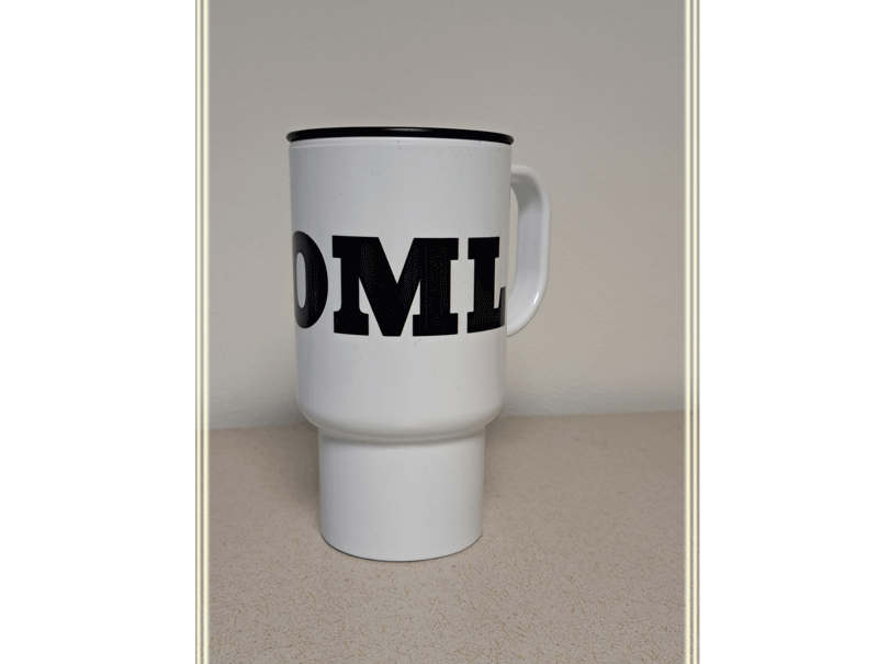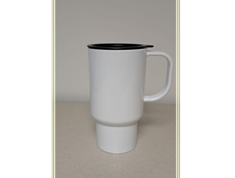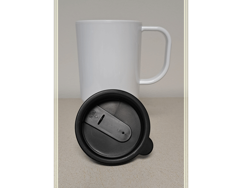 White travel cup, with black 'drink' lid